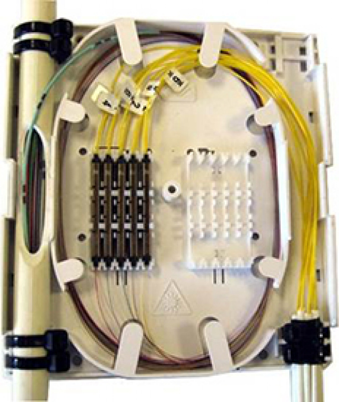 Касета всередині боксу дає можливість щільно зафіксувати гільзи (до 60 мм) зварювання волокон міжповерхового кабелю з абонентськими кабелями / патч-кордами, а на підставі корпусу викладається запас волокон.
