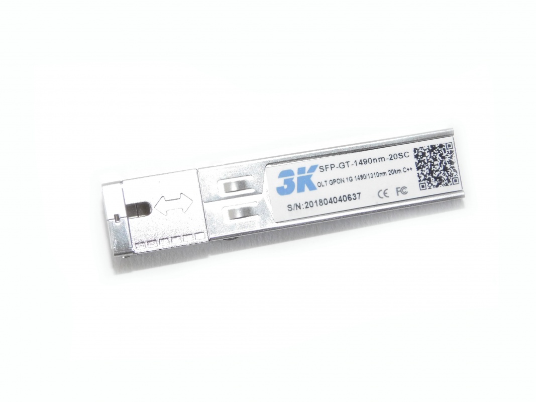 Модуль оптичний 3K SFP-OLT-GPON-1GE-1490/1310nm-20SC (C++) - це GPON трансивер в формфакторі SFP модуля для OLT пристроїв PON мереж, заснований на специфікаціях ITUITU-T G.984.2 Class C ++ для двобічного зв'язку по одному волокну, включає в себевисокопродуктивний приймач 1490/1310 нм з режимами APD/TIA и DFB.За допомогою такого модуля по одному волокну в PON мережі відбувається прийом-передача даних зі швидкістю 1,25/2,5 Гбит/с на дистанцію до 20 км. Модуль відповідає стандарту IEC-60825. Має один оптичний порт с роз'ємом SC/UPC, підтримує можливість швидкої замені і установки без відключення обладнання від живлення і функцію цифрової діагностики (DDM).