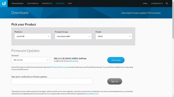 Для того, щоб отримати оновлену версію Ubiquiti для потрібного Вам пристрою, слід перейти на офіційний сайт розробника за посиланням - www.ubnt.com/download. Далі Ви побачите, що відкриється нове вікно, в ньому потрібно натиснути - «Platform» і вибрати з переліку потрібний варіант, такі ж маніпуляції застосовуємо повторно під час здійснення вибору серії обладнання Product Group і моделі: