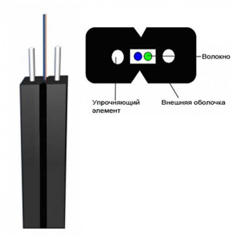 В даному кабелі знаходиться два оптоволокна, які відповідають рекомендаціям ITU-T G.652D. У кабелі також знаходяться два силових елемента. Зовнішнє покриття кабелю - це спеціальний матеріал, який характеризується високим рівнем температурної та хімічної стійкості, вогнестійкістю.